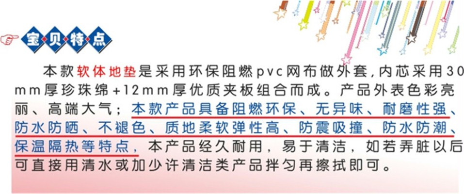 皮革体操垫其面层为多种颜色(红、黄、蓝、绿等)、产品原料采用进口PVC+高密度海绵结合制成,有效保护人或物体从高处坠下而造成的损伤,本公司的安全地垫物理性极高,材质环保,易清洁且排水性好适合铺设于室内外的地面,是保护孩子安全的体类地垫。